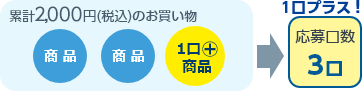 1口プラス例:期間中のお支払い累計が1口プラス商品を3つ含む税込1,000円のお買い物→2口(1,000円で1口+1口プラス) - ● 期間中のお支払い金額の累計が税込1,000円未満の場合は1口プラス適用外です。