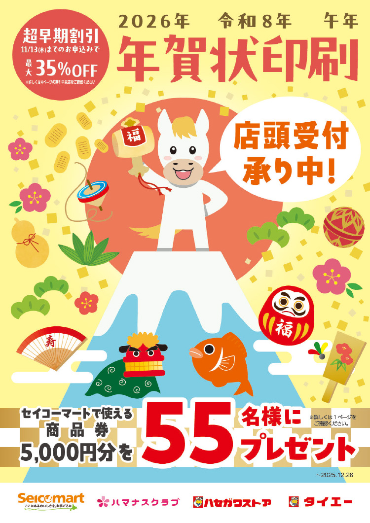※年賀状印刷のお申込みは、北海道内の店舗は11月3日(月)までにお申込みいただいた場合、お渡しは11月6日(木)以降となります。それ以降のお申込みは、お申込み日から3日以降のお渡しとなります。